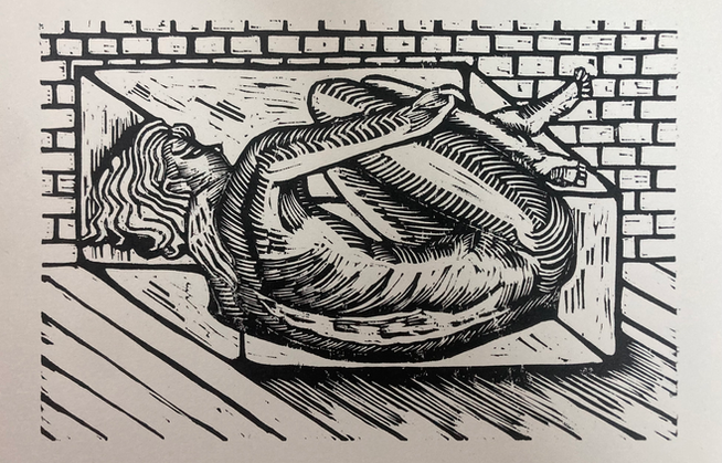 此作品是根據白色恐怖中25個逃亡的身體經驗創作的版畫,以地獄圖的概念發想,結合不同的身體形象,包含胃、聲帶、脊椎、浮力等主題,不同的逃亡空間,包含樹林、溪邊、海上、狹窄的空間,也透過不同的、抽象的線條表現,呈現各種逃亡經驗下的身體。